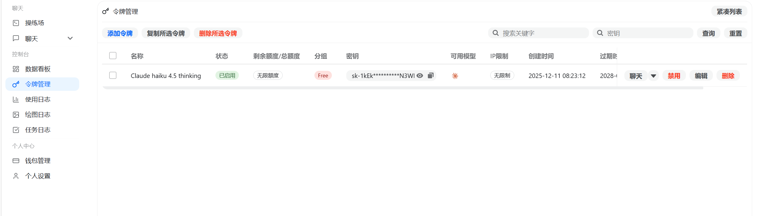 1.点击控制台 -> API令牌页面