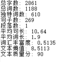 - 统计指标: 总字数、词数、句子数、词汇丰富度、文本熵值、文本质量分等