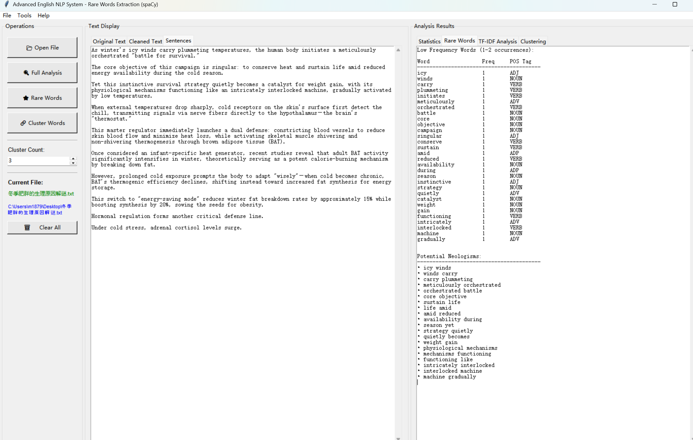 低频词(rare words)提取系统的存在价值正在于此。它能够自动识别和分析那些在文本中出现不频繁但具有高度信息含量的词汇。想象一下,如果你需要快速理解一篇关于量子计算的论文,与其花时间在常见词汇上,不如直接关注那些专业术语和低频词汇——这些词汇往往就是该领域的核心概念所在。本系统采用现代的自然语言处理框架spaCy替代了过时的NLTK库,这一选择解决了长期困扰研究者的模型加载和数据依赖问题。