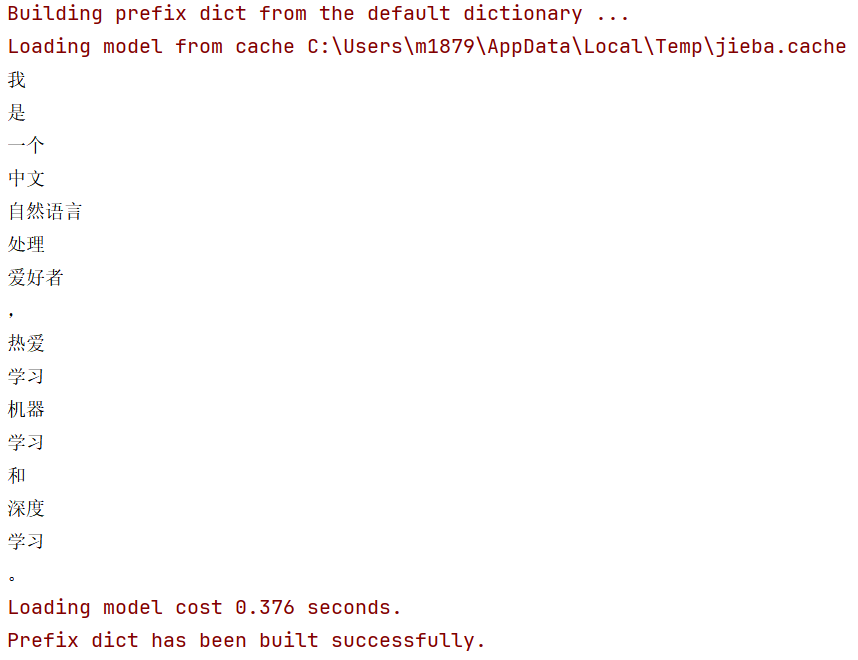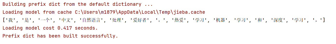 text = "我是一个中文自然语言处理爱好者,热爱学习机器学习和深度学习。"