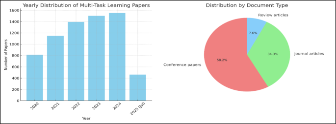 在 2020—2025(截至 2025 年中)的一个统计口径下,多任务学习相关研究呈现出明显的规模增长:检索阶段得到 8,245 条记录,经过筛选、限定文献类型并基于 DOI 与标题去重后保留 6,872 条用于分析。更值得注意的是学科分布:计算机科学 4,698 篇、工程 1,135 篇、数学 498 篇、医学健康 241 篇、决策科学 113 篇等,构成了多任务学习的主要“供给侧”。这些数字并不仅仅说明“大家都在发 MTL”,它更说明深度多任务学习的核心价值点更容易在技术密集型领域被兑现:这些领域往往天然存在多个相关预测目标、多个互补数据源、以及更强的计算基础设施,从而更容易探索复杂共享结构与多目标训练策略。反过来,MTL 在医学、健康、心理、教育等领域出现并扩展,也暗示“多源、多端点、多指标”正在成为数据驱动建模的常态,而多任务学习提供了一种把这种复杂性组织起来的方式。