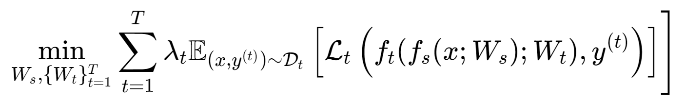 多任务学习是典型的多目标优化(multi-objective optimization):每个任务都有自己的损失函数,理想状态是找到一组参数使所有任务都尽可能好,但现实中经常存在不可兼得。最常用的做法是把多目标问题转成单目标,用加权和来优化: