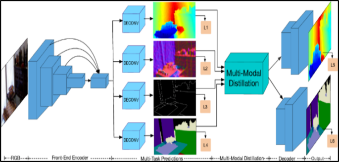 除了在表示层面做混合,单域多任务还常见一种更“监督驱动”的信息流:预测蒸馏(prediction distillation)。它受到知识蒸馏思想启发:让某个任务的预测结果作为另一个任务的额外监督信号,从而把任务间关系编码到训练信号里,而不一定直接共享参数。直观上,这相当于把“任务 A 学到的中间结论”当成“任务 B 的软标签”或“辅助约束”,使得任务 B 在学习自身目标时,同时对齐任务 A 的预测结构。预测蒸馏的价值在于:即便任务的输出空间不同,只要它们之间存在可表达的关联(例如深度估计与语义分割在几何与语义层面互补),就能通过预测层面的互监督建立联系。