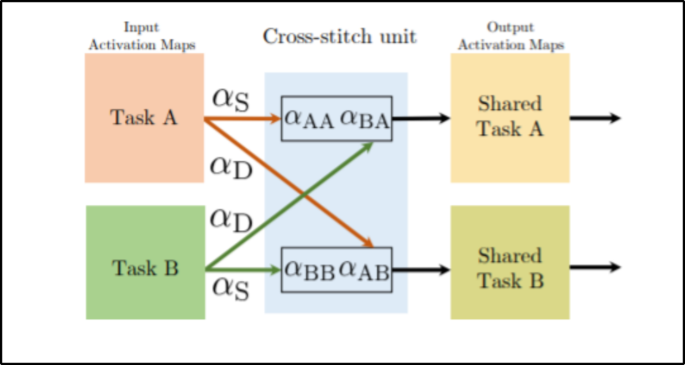 当任务之间既相关又存在较强差异时,仅靠共享主干可能不够灵活,于是出现了另一类思路:每个任务保留一套网络,但允许它们在对应层之间交换信息。跨层信息流(cross-talk)或更典型的 cross-stitch 结构,就是把“共享”从“共享同一组参数”改成“共享同一层的表示并且共享比例可学习”。cross-stitch 的核心机制是对齐各任务网络的中间表示,然后用一个可学习的线性混合把不同任务的表示按比例融合到各自分支里,等价于让任务自己决定哪些层该共享、共享多少。这样做的理论含义非常明确:共享不是结构事实,而是一个在训练中被学习出来的门控矩阵,从而能在一定程度上缓解负迁移。