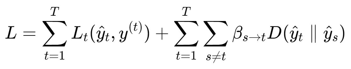 如果用一个抽象损失来表达预测蒸馏的思想,可以写成“每个任务既要对齐真实标签,也要对齐来自其他任务的教师信号”的形式:
