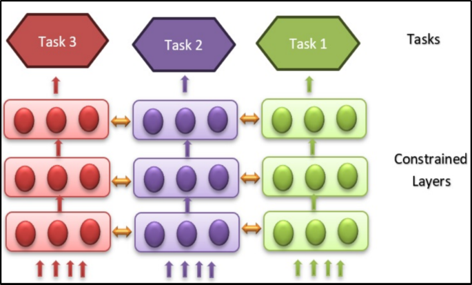 为了把这种“共享即正则化”的直觉更工程化,一种常见做法是用显式正则项去鼓励任务参数之间相似,而不是强制它们完全相同;这就自然引出软参数共享(soft parameter sharing)。软共享本质上是把“共享表示”从结构层面挪到优化层面:结构上每个任务都有自己的参数,优化上用正则项让它们不要差得太远,只有当任务确实需要差异化时才允许偏离。这种思路非常适合“任务部分相关、但又不完全一致”的场景,因为它把共享程度变成了一个可调的连续量,而不是硬共享那种二值选择。