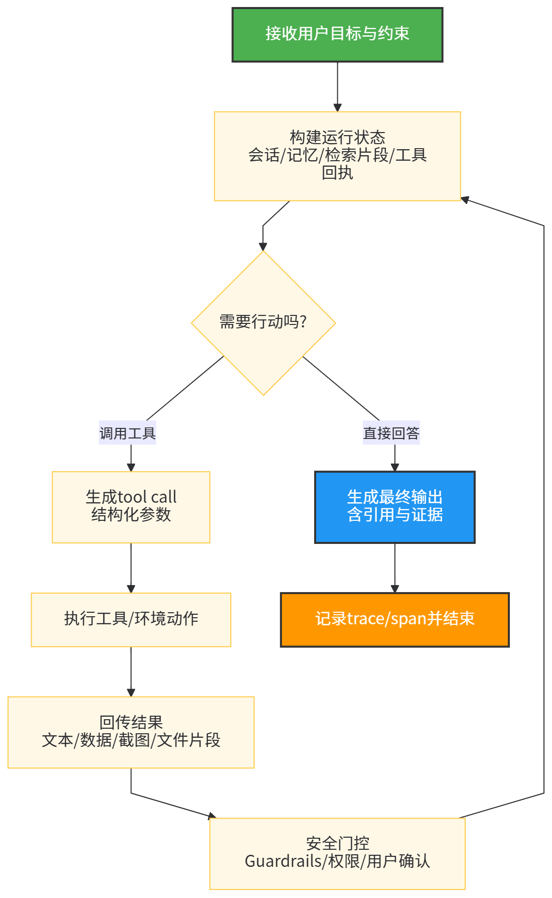 讨论“Agent架构”之前,先把“Agent”与“聊天”区分清楚。聊天系统的核心闭环往往是“输入→生成→输出”,即使加入了少量工具(例如单次检索),本质上仍是“为了一次回答服务”。而通用Agent的闭环更接近“观察—推理—行动—再观察”的反复迭代,它必须把外部世界当成状态机/环境来处理:网页会变化、文件会更新、工具会失败、权限会不足、用户会改变目标,系统不能只追求一次性输出的“看起来正确”,而要在执行过程中持续校正。OpenAI在Agents SDK中把这种闭环直接做成内建的“agent loop”,强调其负责工具调用、回传结果、持续循环直到模型停止。