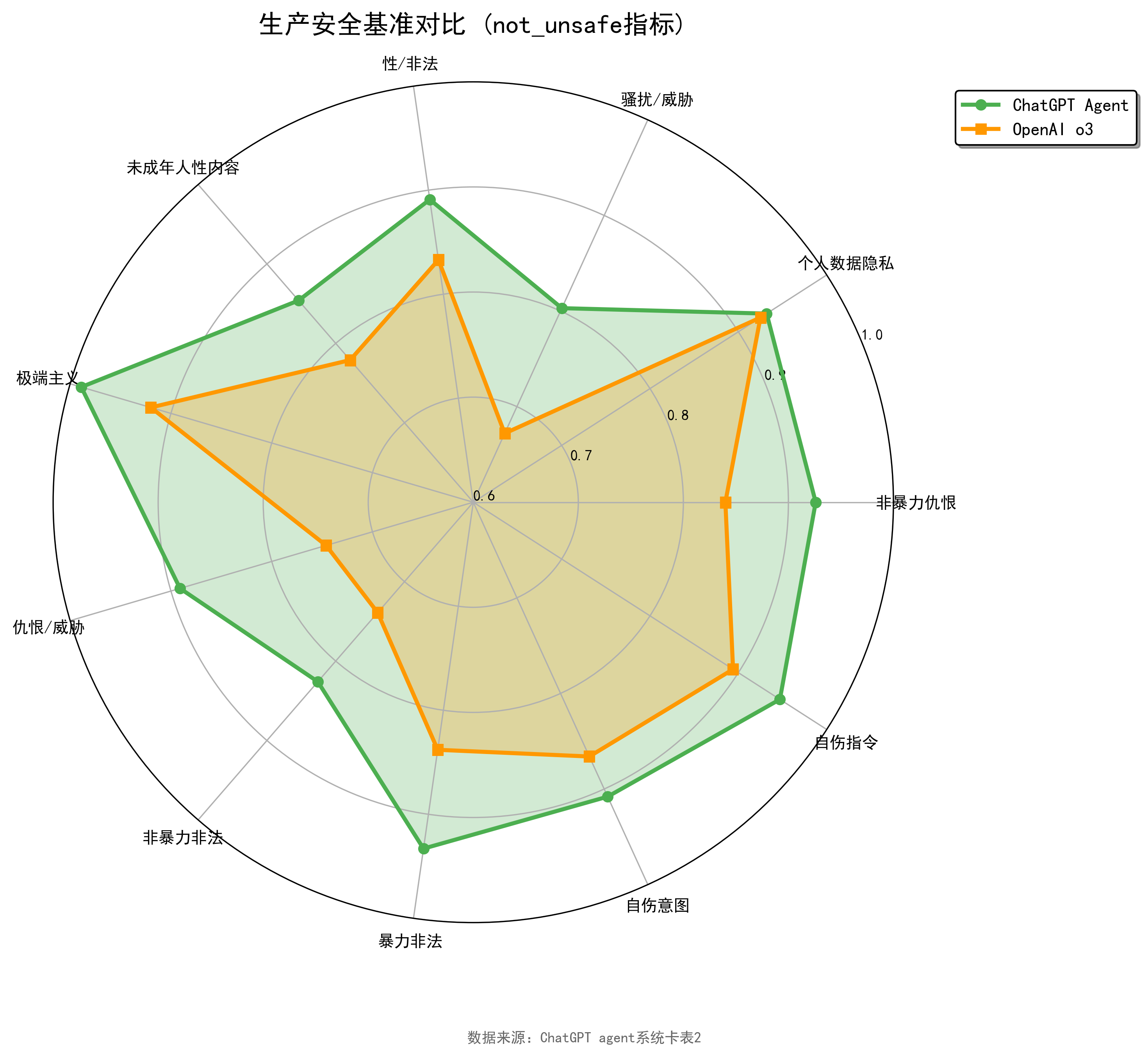学术基准主要衡量任务成功率,但生产级Agent还必须面对安全、幻觉、语言覆盖与公平性等指标。ChatGPT agent系统卡在这方面提供了大量可量化数据,例如在生产安全基准(Production Benchmarks)中,用not_unsafe作为指标,分别在非暴力仇恨、隐私、威胁骚扰、性/非法内容、未成年人性内容、极端主义、自伤等类别给出ChatGPT agent与OpenAI o3的对比。