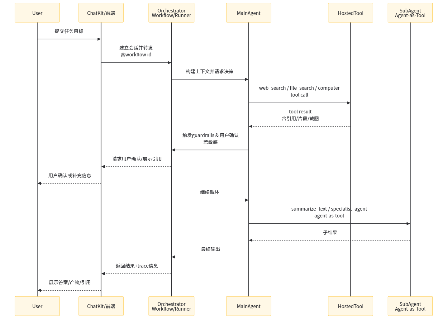 为了把Agent从“看起来很聪明”变成“可运营”,架构里必须有一套能被工程系统理解的运行对象。2025年OpenAI平台文档中,“会话”“工作流ID与版本”“工具调用对象”“trace与grader”等概念都被提升为平台级能力:Agent Builder发布工作流时会生成可版本化的工作流对象;ChatKit在前端嵌入聊天体验时会创建会话并以workflow作为后端;Responses API通过工具调用对象返回web_search_call、open_page、find_in_page等动作以及引用注释;Agents SDK内建tracing用来可视化与调试agentic flows。