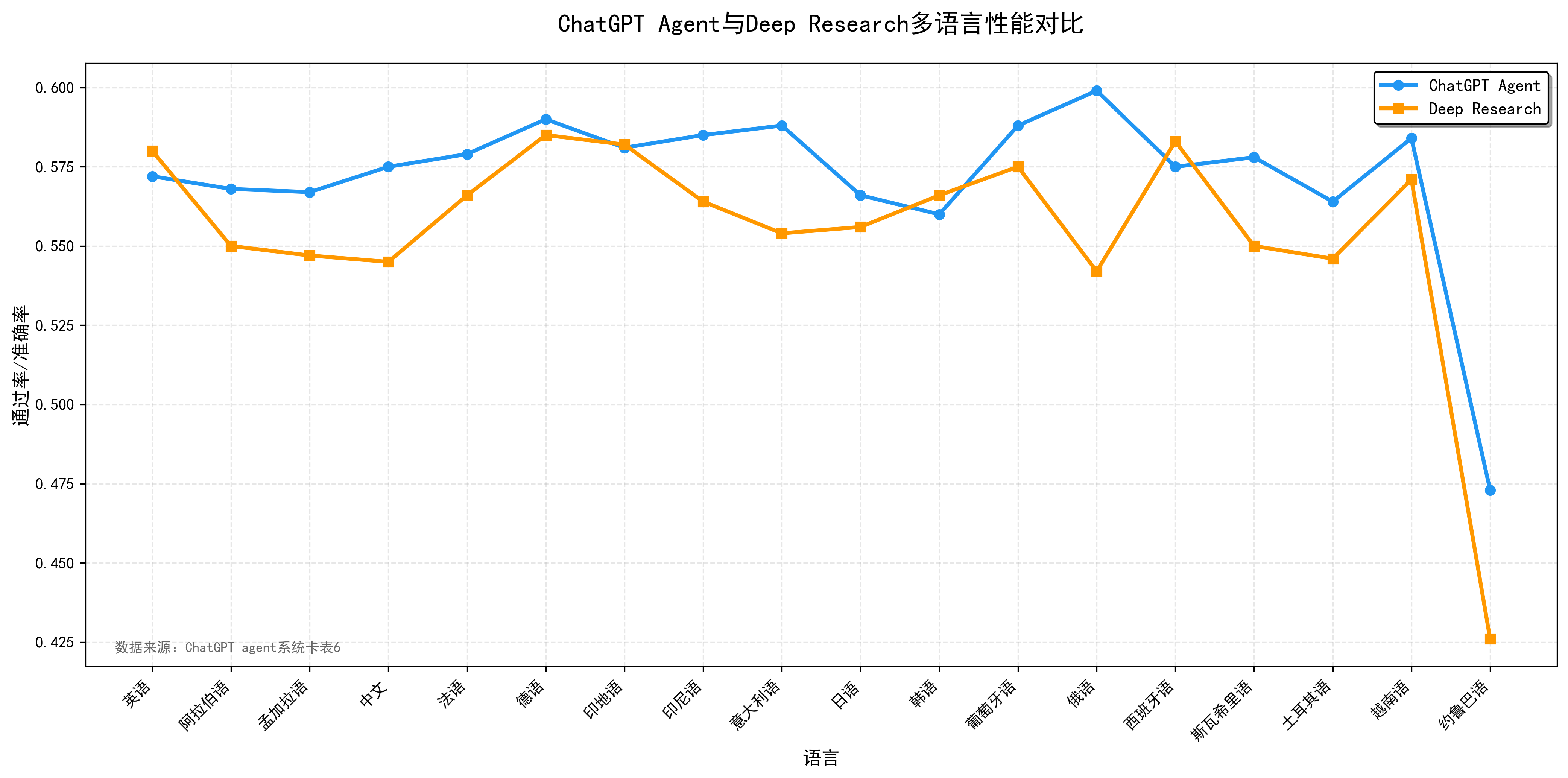 在多语言覆盖方面,系统卡给出ChatGPT agent与deep research在多种语言上的通过率/准确率数据,这些数据非常适合用来讨论“多语言下性能退化是否显著”以及“工具增强是否影响语言差异”。