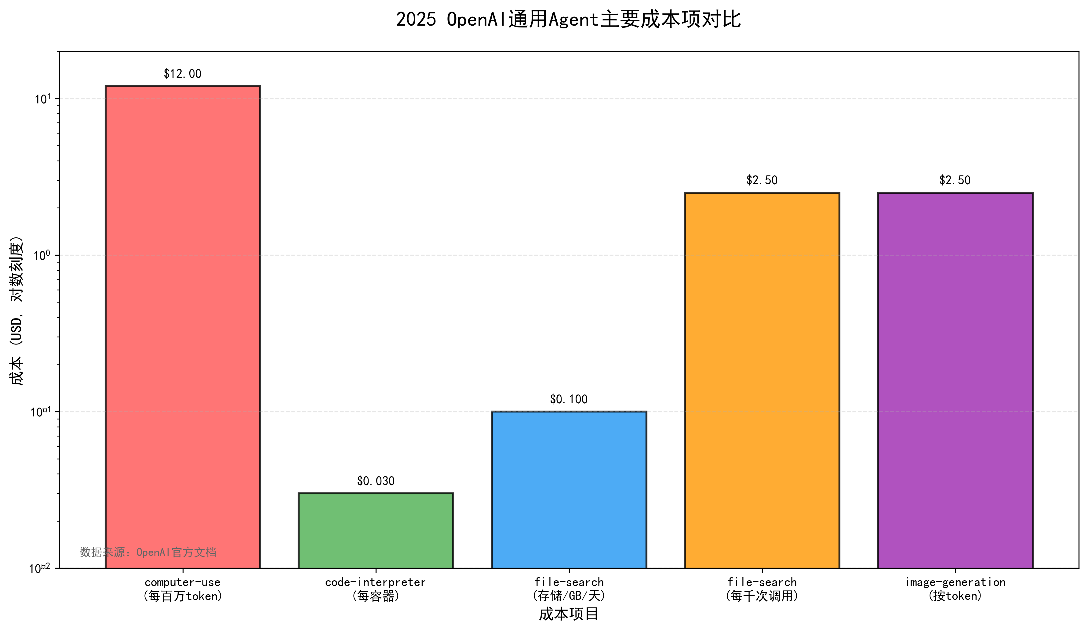 通用Agent的成本模型比传统聊天复杂得多:不仅有模型token成本,还有工具调用成本、向量存储成本、代码沙盒容器成本等。Responses API更新给出了多项工具成本:code interpreter $0.03/容器,file search $0.10/GB/天 + $2.50/1000次工具调用,图像生成按token与图像token计费,并指出调用远程MCP server工具本身无额外费用(主要计输出token)。 computer-use-preview模型页则给出其token价格(输入$3、输出$12/百万token)。