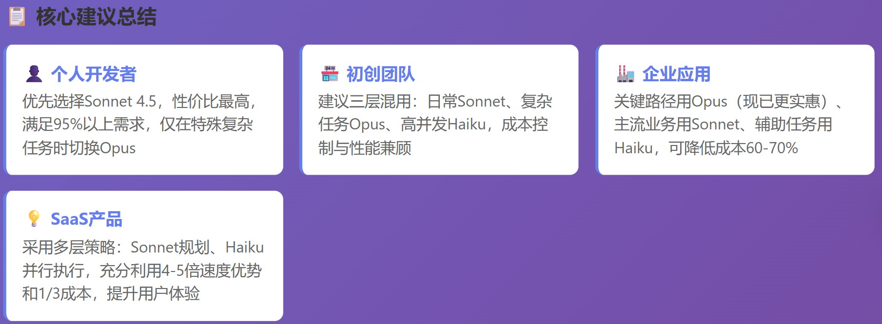 在选择合适的模型时,建议遵循以下原则:对于对延迟高度敏感、并发度高、单个任务简单的场景,选择Haiku 4.5。对于日常编程工作、对话交互、需要中等复杂度推理的任务,选择Sonnet 4.5。对于企业级关键任务、长距离复杂工作流、多代理系统协调,选择Opus 4.5。在构建系统时,可以混合使用不同的模型,利用Sonnet 4.5规划、Haiku 4.5执行子任务、Opus 4.5进行最终检查的策略,实现成本和性能的最优平衡。
