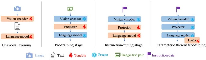 对齐的目标可以理解为一种条件建模:在给定视觉内容的条件下,模型应输出与图像一致、可执行、可推理的文本。为了让这个条件建模稳定成立,训练配方通常会把“视觉对齐”与“指令跟随”分成阶段,分别控制可训练参数的范围与数据的任务形态:先用图文对或交错图文数据让接口学会把视觉信息以语言模型能理解的方式表达出来,再用指令数据把这种表达嵌入对话结构,让模型在多轮上下文里学会“按指令做事”。这种分阶段策略的理论动机在于:如果在早期就让全部模块大幅更新,容易破坏语言模型已有的语义组织能力;而如果永远只训练连接器,又可能让视觉信息只能以很弱的方式进入语言模型,导致细粒度识别与长链推理不稳定。
