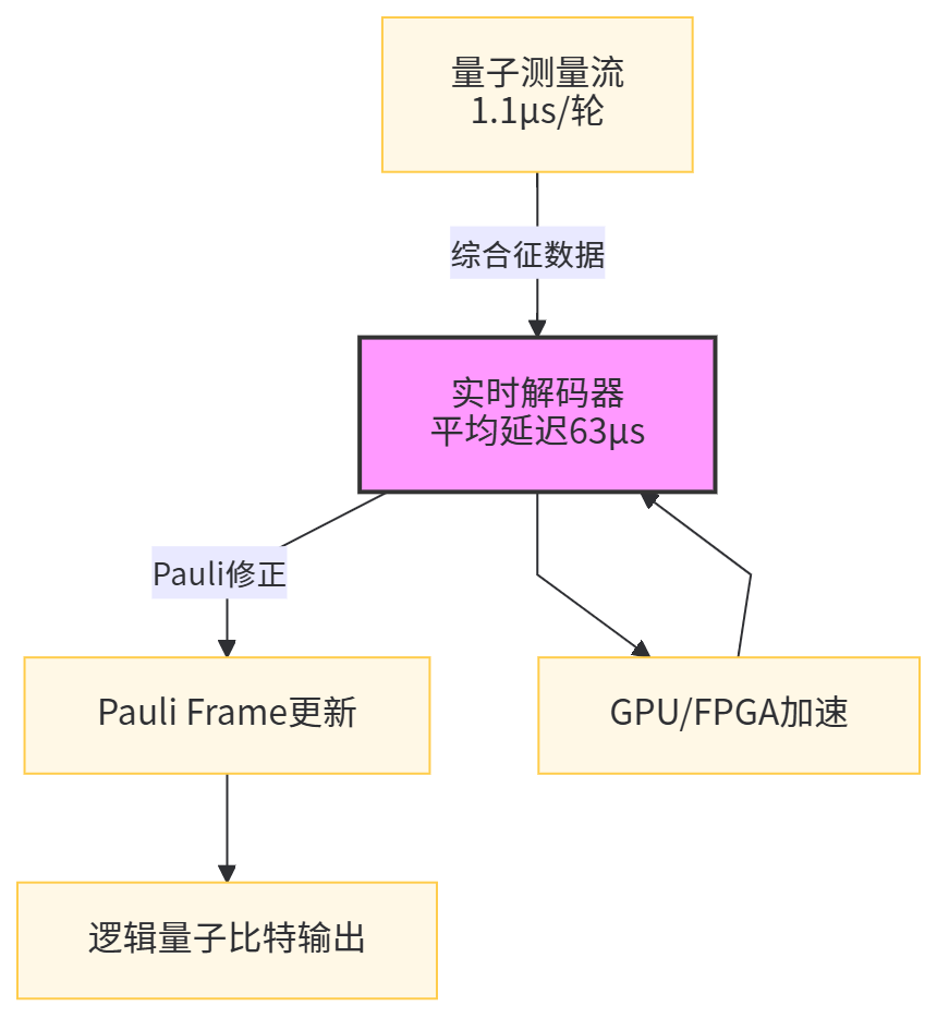 | 超导处理器A:集成实时解码的距离5表面码 | 72 量子比特 | 距离5 | 报告集成实时解码;公开报告给出平均延迟约63微秒、周期约1.1微秒(距离5) | 解码成为低延迟推理任务;需要高吞吐学习/匹配算法 |