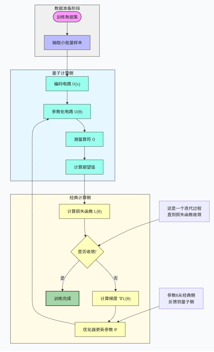这个表达式与经典神经网络的差异并不在于“是否是函数逼近器”,而在于输出的获取方式:你得到的是期望值的统计估计。于是训练的每一步都涉及“测量次数—方差—优化器稳定性”的折中。变分模型之所以在 NISQ 时代被广泛研究,是因为它对相干时间要求相对较低,并且能够与经典优化器形成闭环,这一点在变分混合算法理论中被系统讨论。