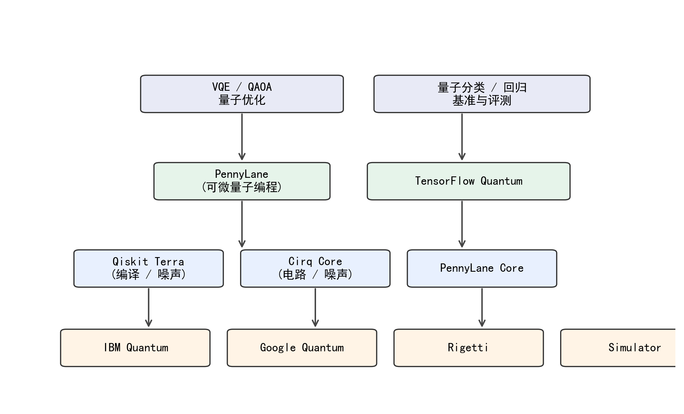 | TensorFlow Quantum | 面向混合量子-经典 ML 的 TF 框架 | 2.1k | 643 | 与 TF/Keras 深度集成,适合大规模仿真与混合工作流 |