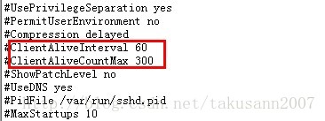 ClientAliveCountMax 300 #server发出请求后,客户端没有响应得次数达到300,就自动断开连接