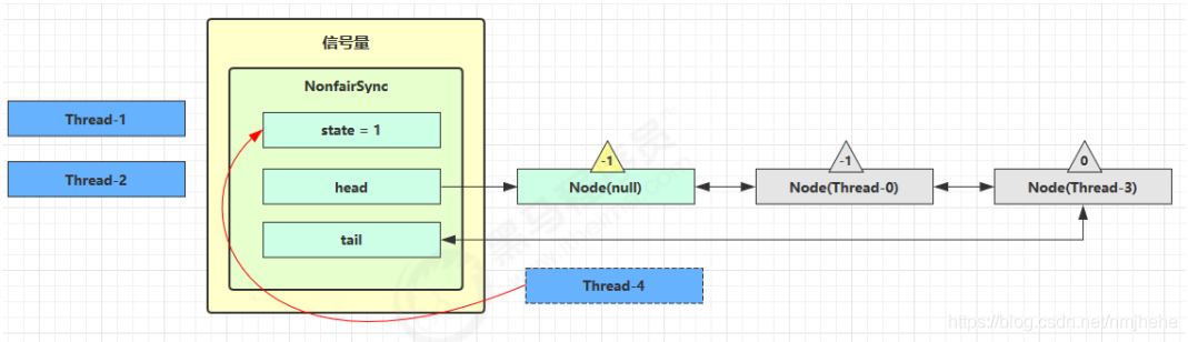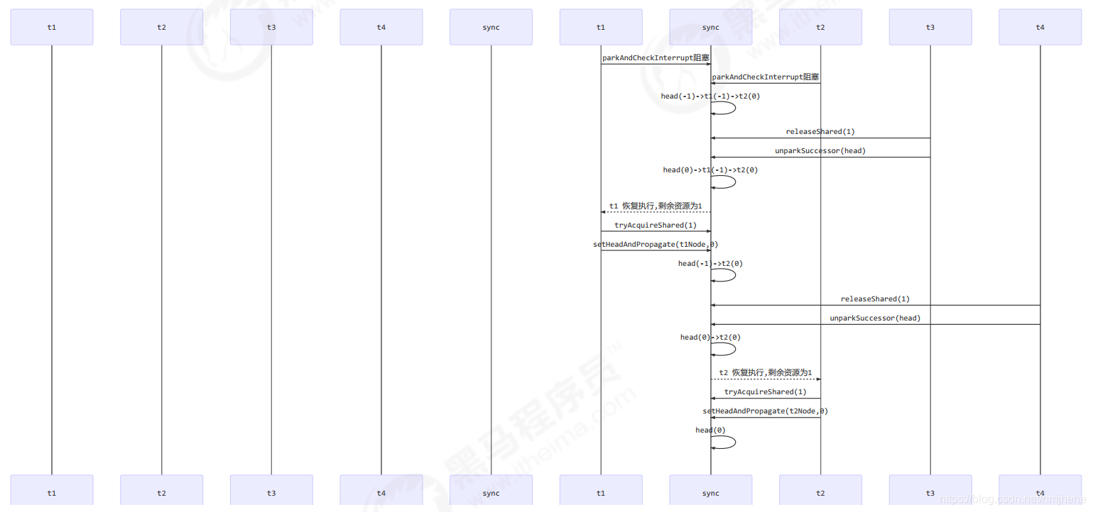 3. T4 调用 releaseShared(1),此时 head.waitStatus 为 0(此时读到的 head 和 1 中为同一个head),不满足