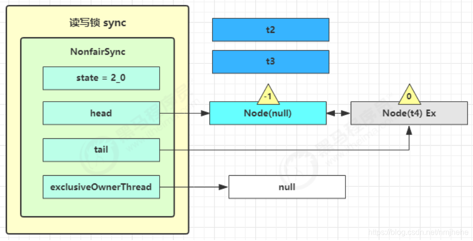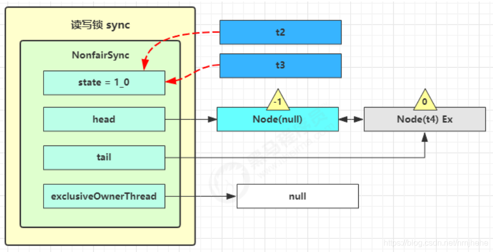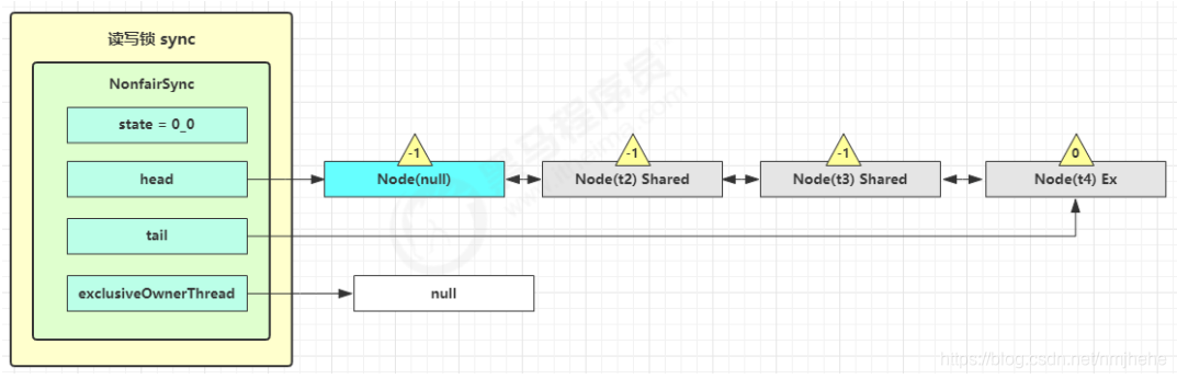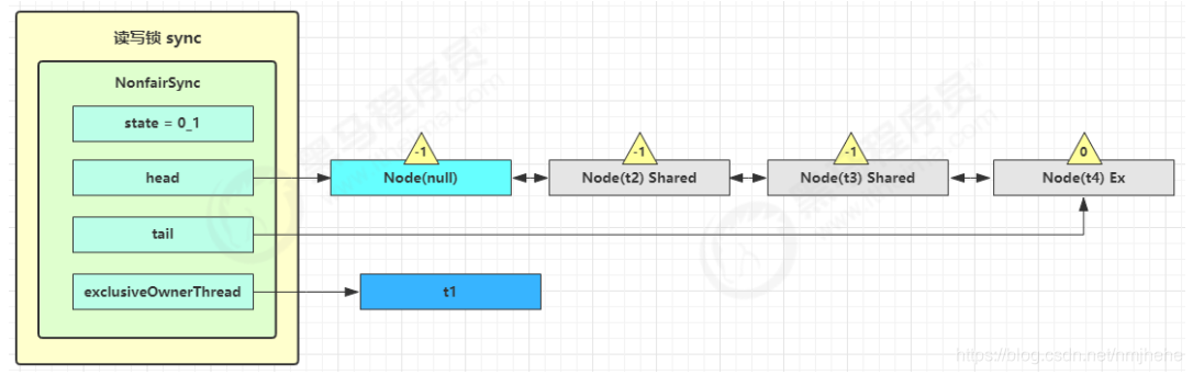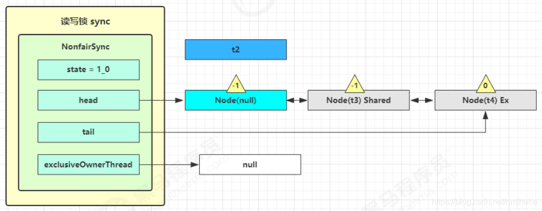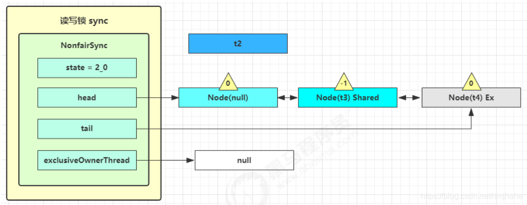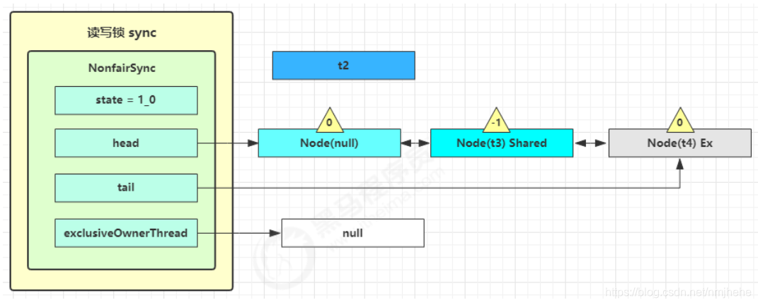 这种状态下,假设又有 t3 加读锁和 t4 加写锁,这期间 t1 仍然持有锁,就变成了下面的样子