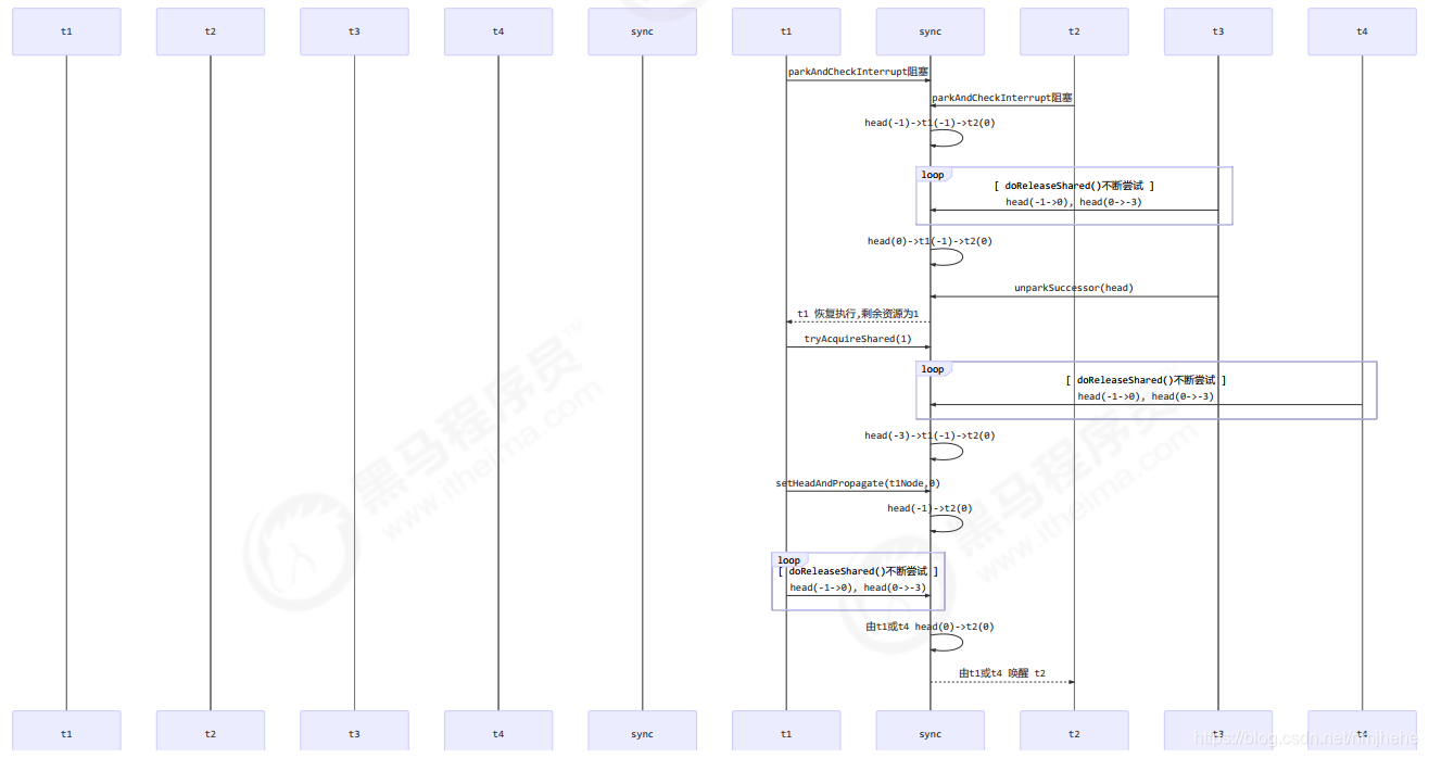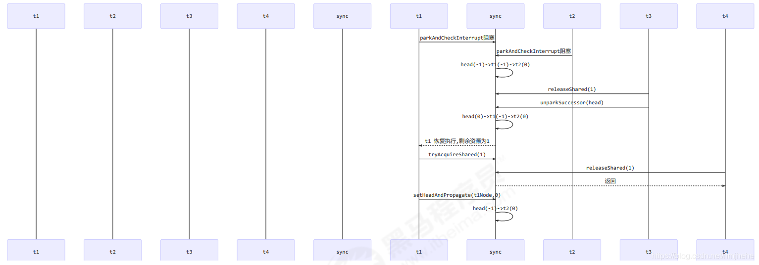 4. T1 获取信号量成功,调用 setHeadAndPropagate 时,读到 h.waitStatus < 0,从而调用