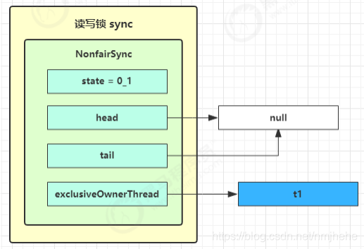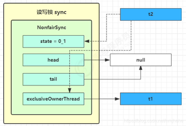 1) t1 成功上锁,流程与 ReentrantLock 加锁相比没有特殊之处,不同是写锁状态占了 state 的低 16 位,而读锁