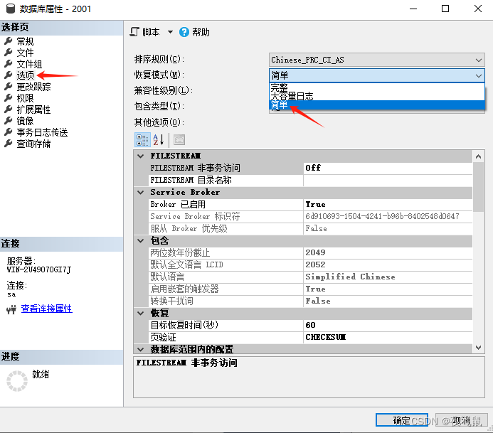 (1)将数据库的恢复模式由完整模式修改为简单恢复模式,点击数据库对象右键选着属性,然后选着选项,将恢复模式由完整修改为简单模式。修改为简单模式的原因是使 sql server 立即将内存中的数据写入到磁盘中,保证了用户的操作数据不会丢失。