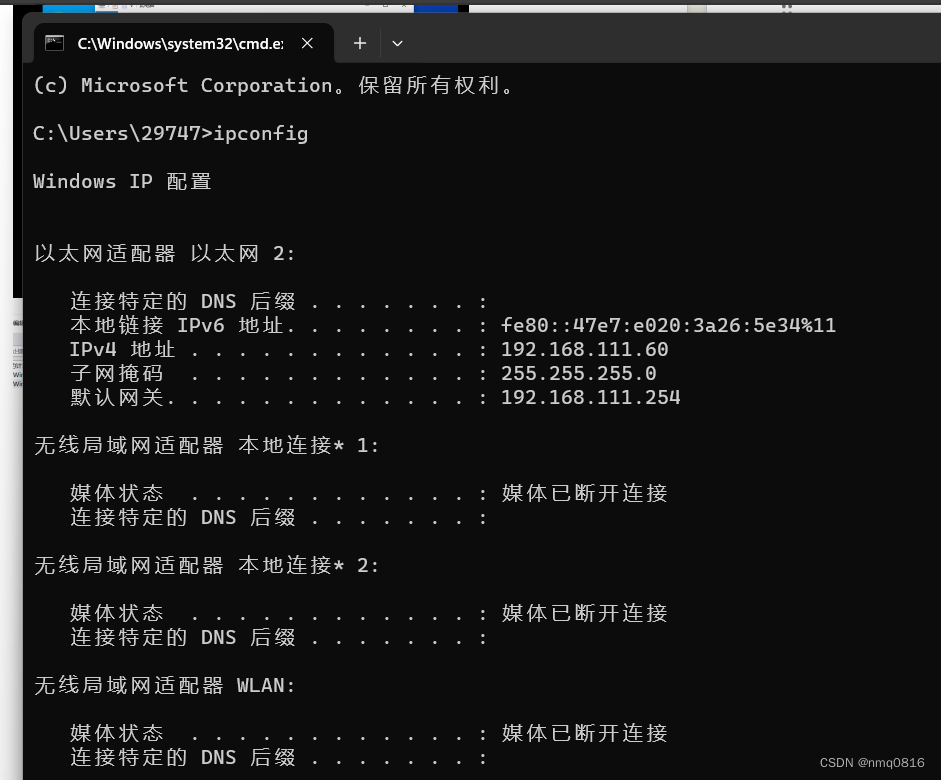 IP 地址查看1:win+r输入cmd,回车、然后输入IPconfig