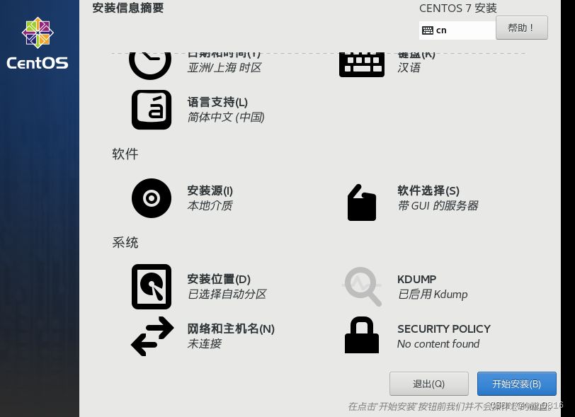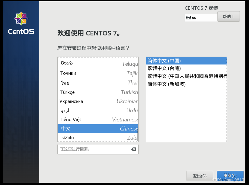 Linux系统安装5:第一步:往下翻选择中文、第二步:简体中文、第三步:确认、第四步:选择软件选择、第五步:打开选择带gui的、第六步:开始安装