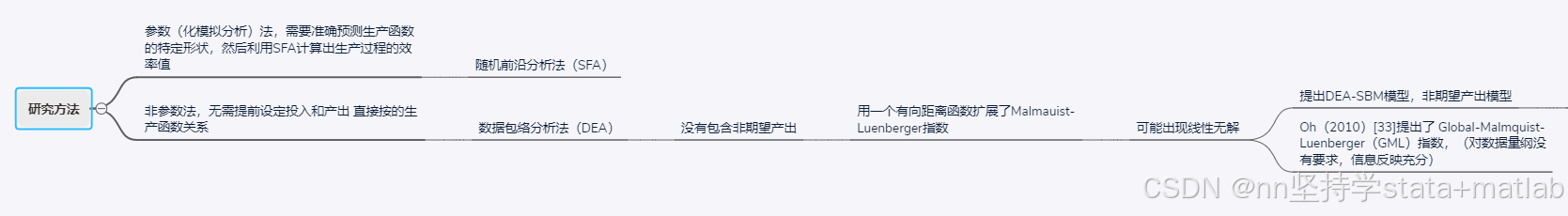 | 参数法 | 随机前沿分析法(SFA) | 需要准确预测生产函数的特定形状,然后利用SFA计算出生产过程的效率值 | ||