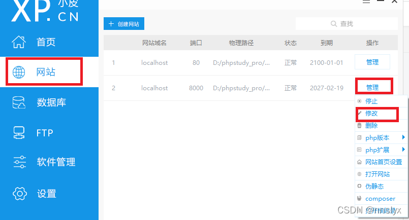 记录一下,安装好tp6后,不需要手动改写nginx的配置文件nginx.conf,只需要在phpstudy中创建网站后,点击“管理”->“修改”。