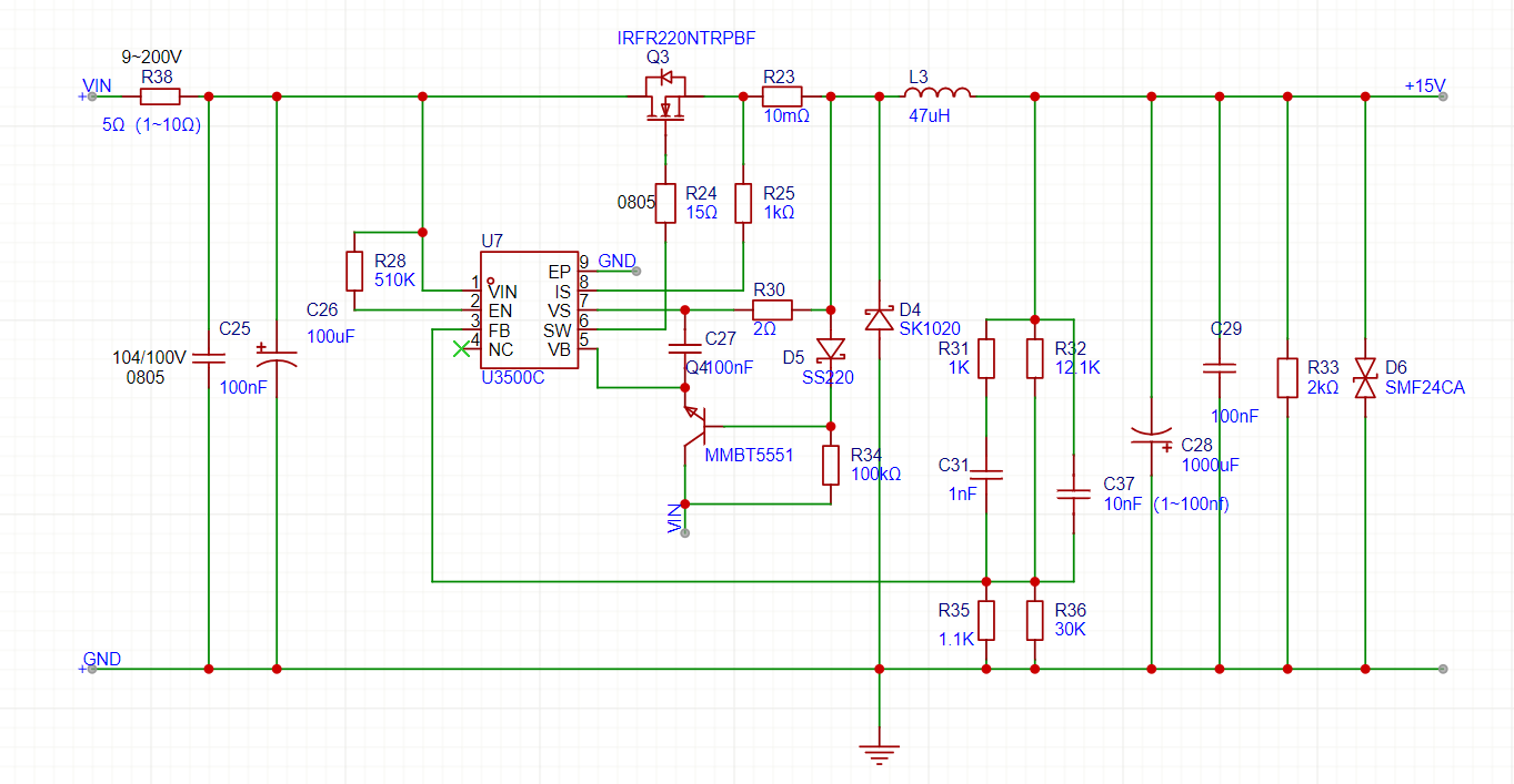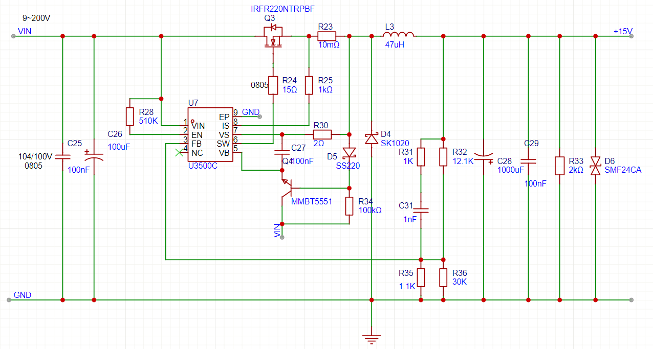 做了一个DCDC降压模块,理论上可实现9-200V的可调节降压。在使用30V小电源时正常使用,拿实验室0-300V电源试试大电压降压效果,结果接上去降压芯片没输出。