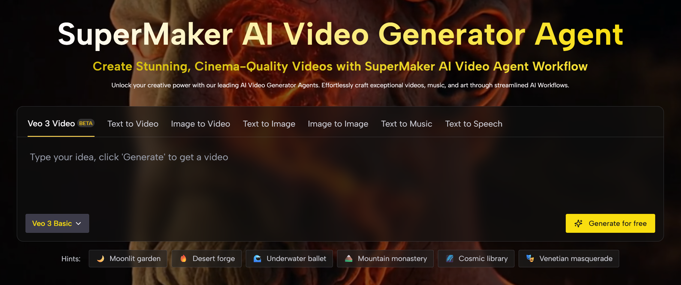 SuperMaker AI 是一款AI视频生成平台,基于AI Agent工作流,集成视频、图像、音频和语音生成,提供高质量的电影级视频输出,适用于多种专业场景。