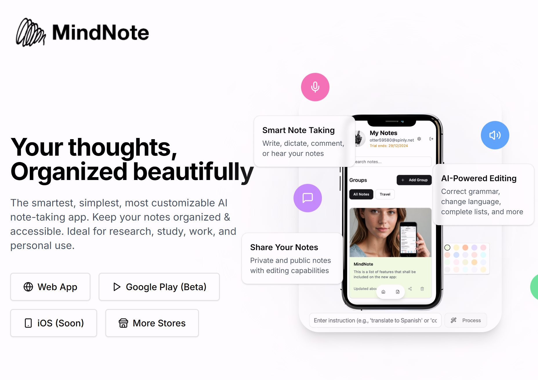 Mindnote是一款AI笔记工具,能帮助用户捕捉和组织想法,支持写作、YouTube视频转录、多语言语音转文本,可分享笔记。