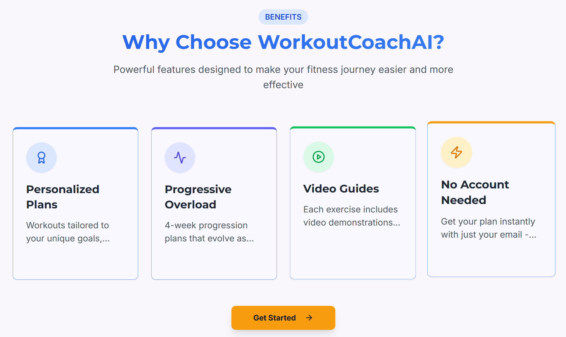 WorkoutCoachAI是一款AI健身计划软件,能根据用户目标、设备和时间快速生成个性化锻炼计划,提供视频演示,支持从简到繁的锻炼强度。