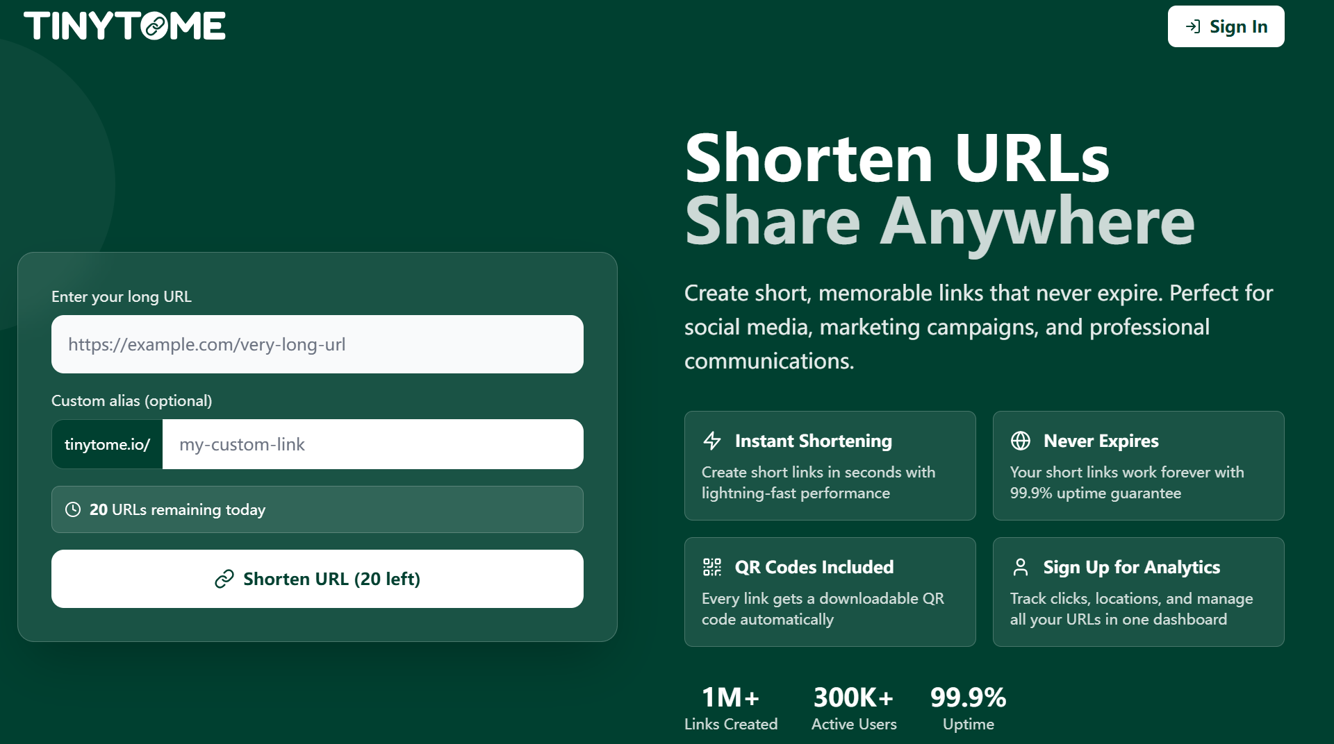 TinyTome是一款免费的URL缩短和二维码生成工具,链接永不过期和提供深度分析。