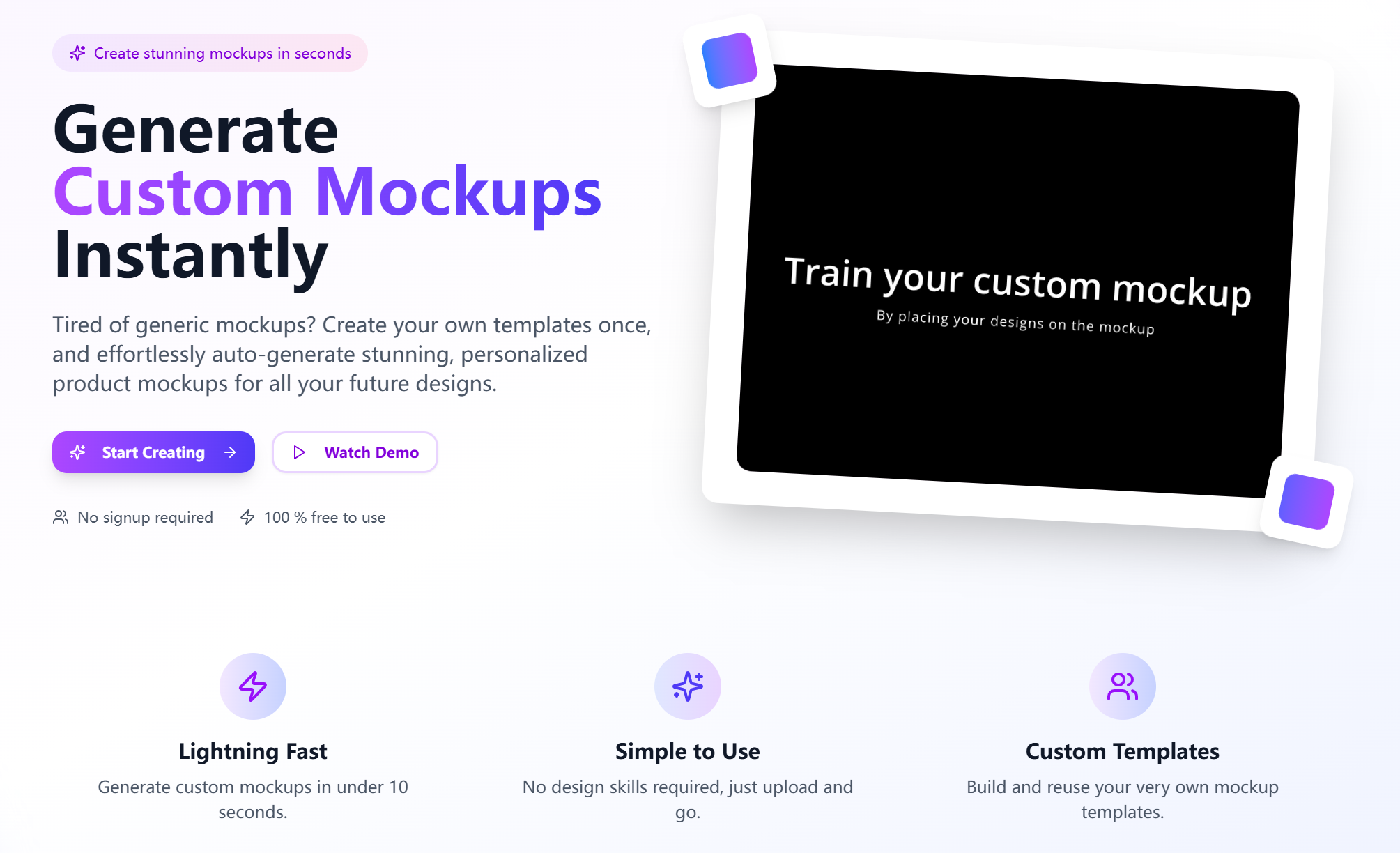 Custom Mockup Generator是一款在线工具,用户可以快速生成独特的产品原型图,无需Photoshop技能,上传一次模板后可在10秒内自动生成新设计。