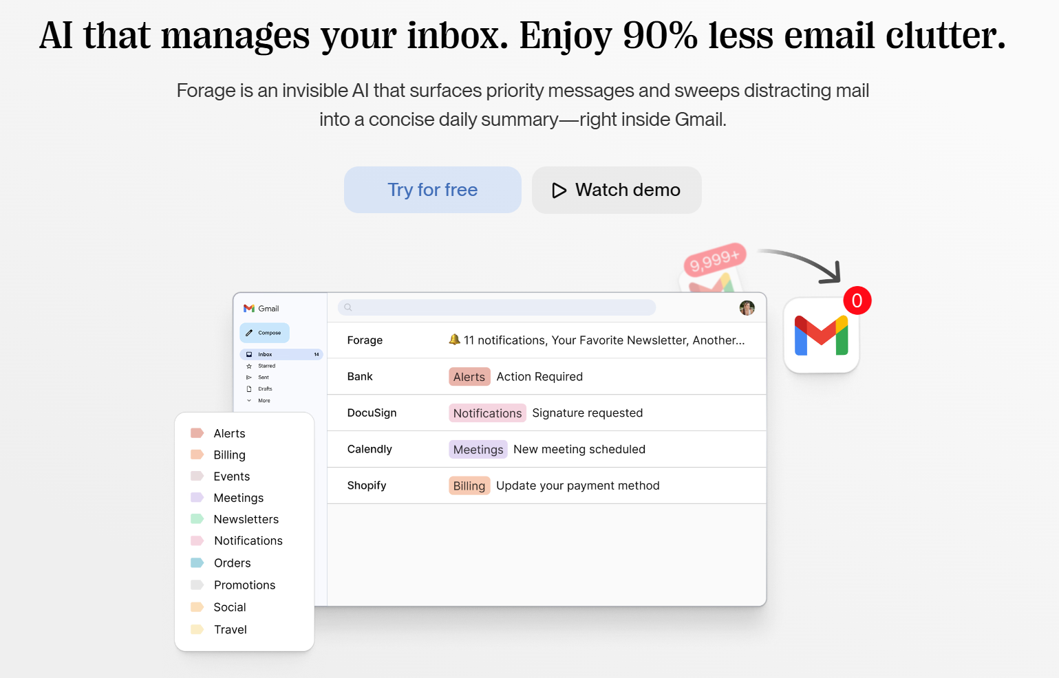 ForageMail是一款Gmail插件,自动过滤收件箱,将非重要邮件汇总为每日简报,帮助用户高效管理邮件。