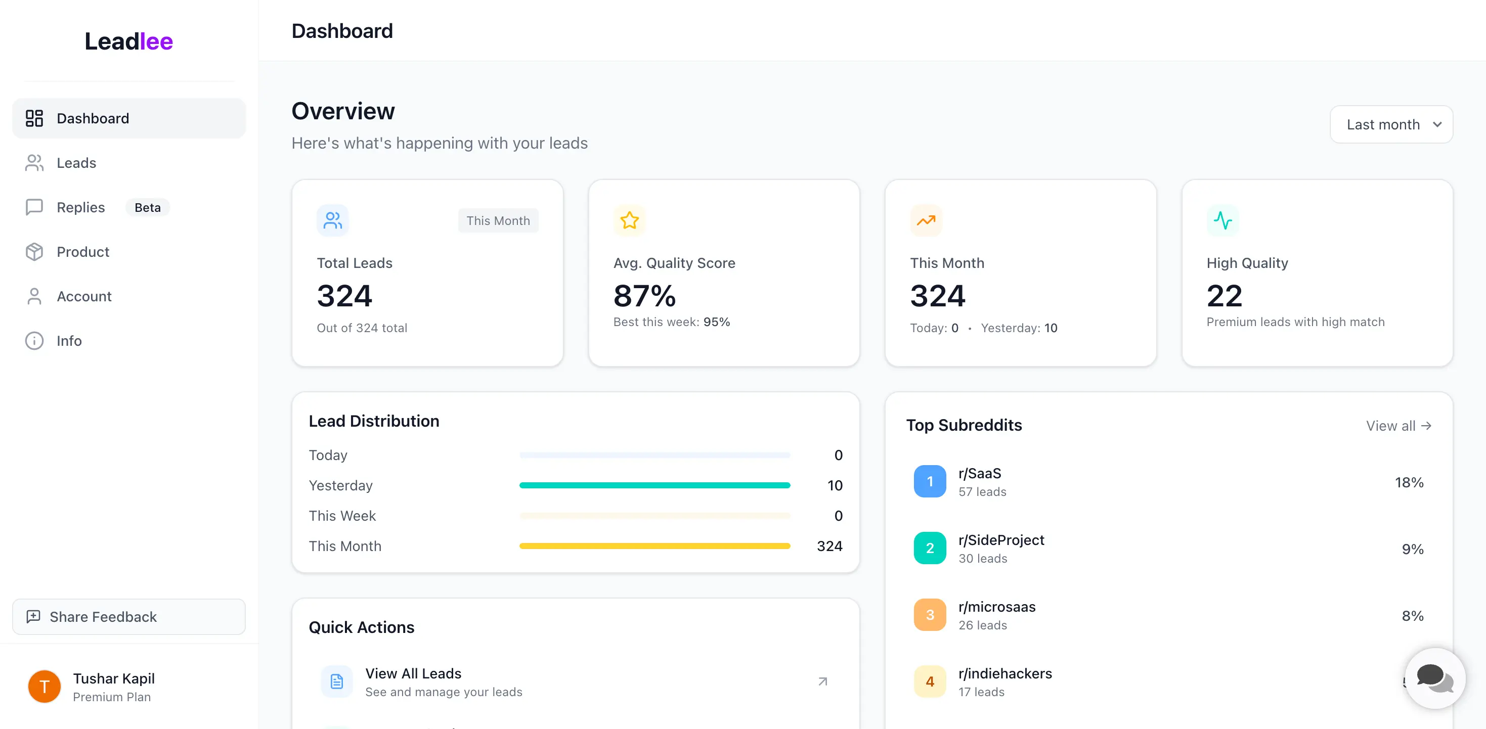 LeadLee是一款客户获取工具,监控相关Reddit子版块,寻找潜在客户帖子并自动回复,从而帮助产品快速增长。