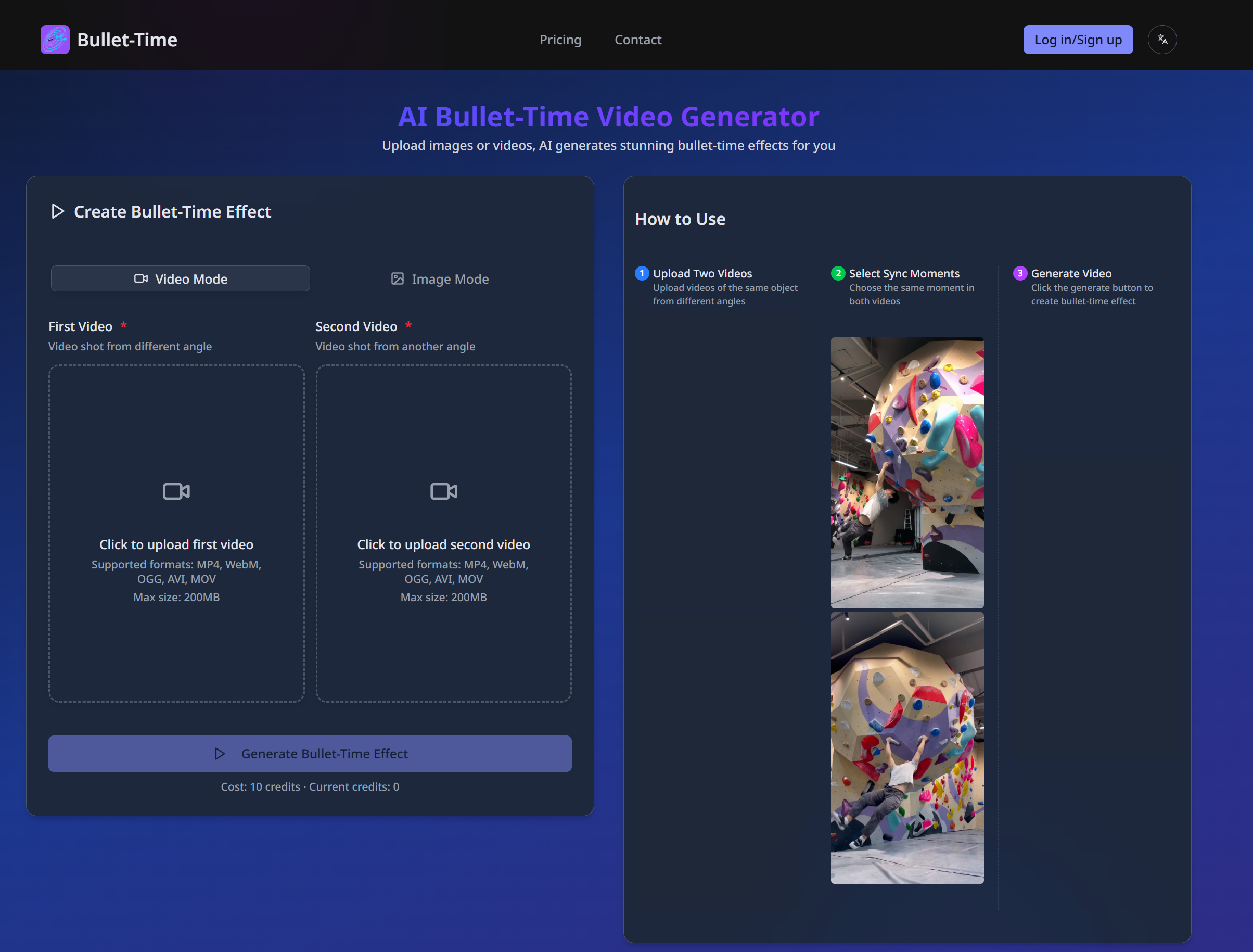 Bullet-Time是一款AI驱动的视频生成工具,使用先进的人工智能技术将图像转换为令人惊叹的子弹时间效果视频,快速创建电影般的慢动作体验。