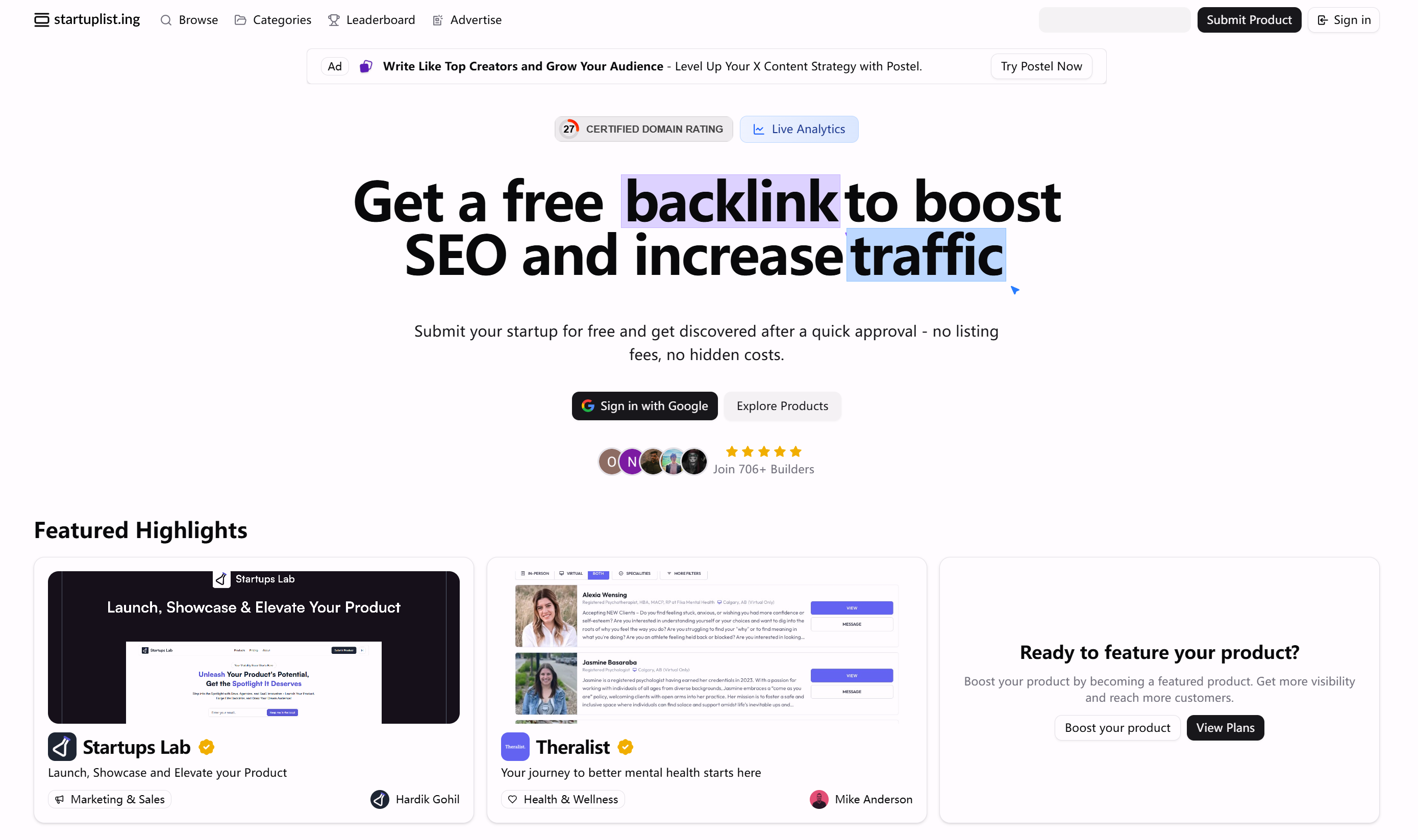 startuplist是一款初创公司启动平台,帮助早期创业公司展示产品、获得曝光、赚取反向链接并实现增长。