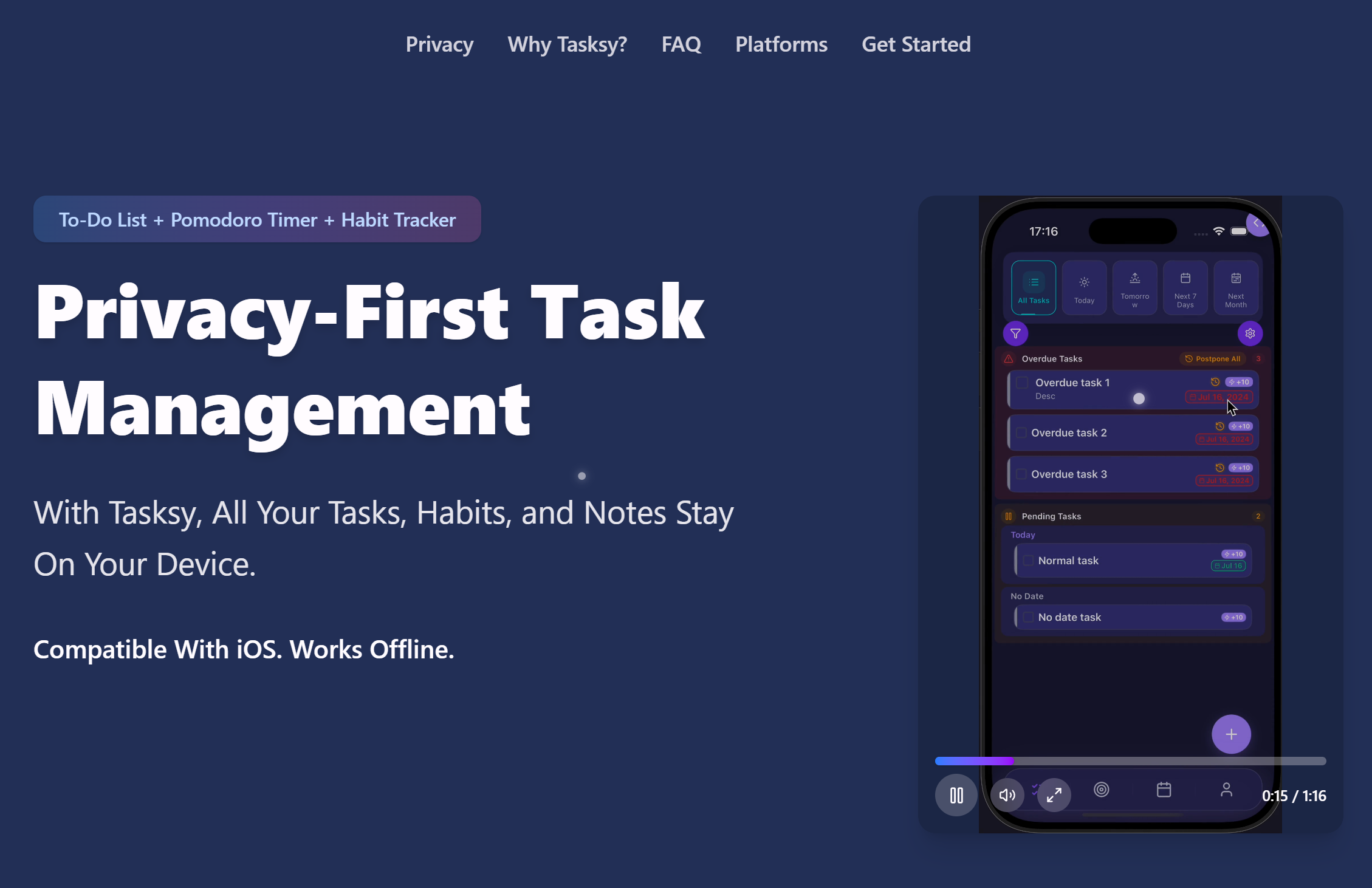 Tasksy是一款离线优先的效率应用,结合任务、笔记、习惯和专注工具,并通过游戏化元素提升用户体验。