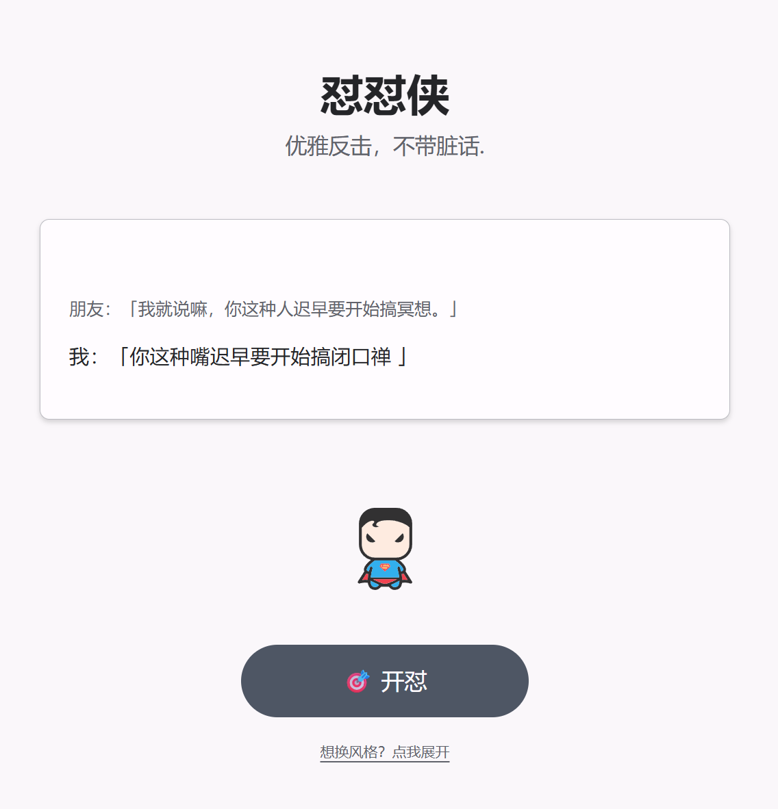 怼怼侠是一款怼人金句生成器,使用AI生成文明、不带脏话的反击句子,帮助用户优雅地应对阴阳怪气和冷嘲热讽。