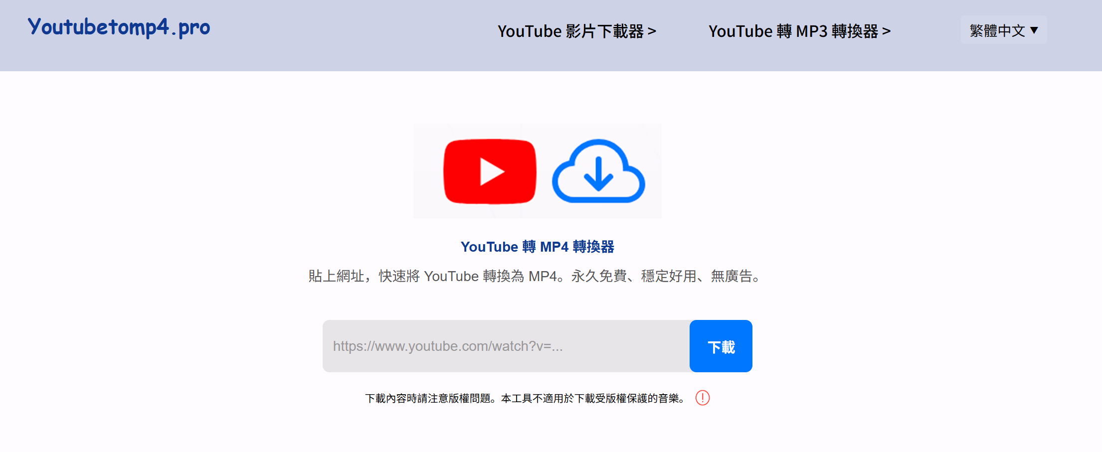 youtubetomp4是一款在线视频下载工具,可以在数秒内将YouTube影片转换为高品质的MP4、MP3等格式,100%安全,无广告,免登入。