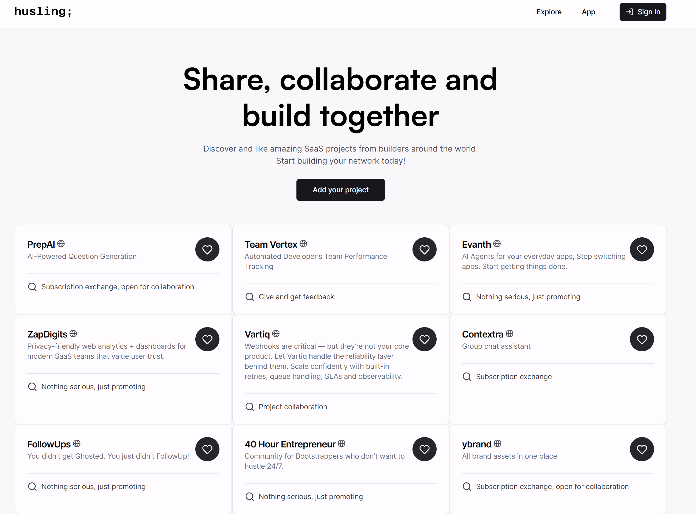 Husling是一款帮助SaaS开发者寻找合作伙伴的应用,用户可以通过注册、添加项目来实现合作、交流订阅和分享知识。
