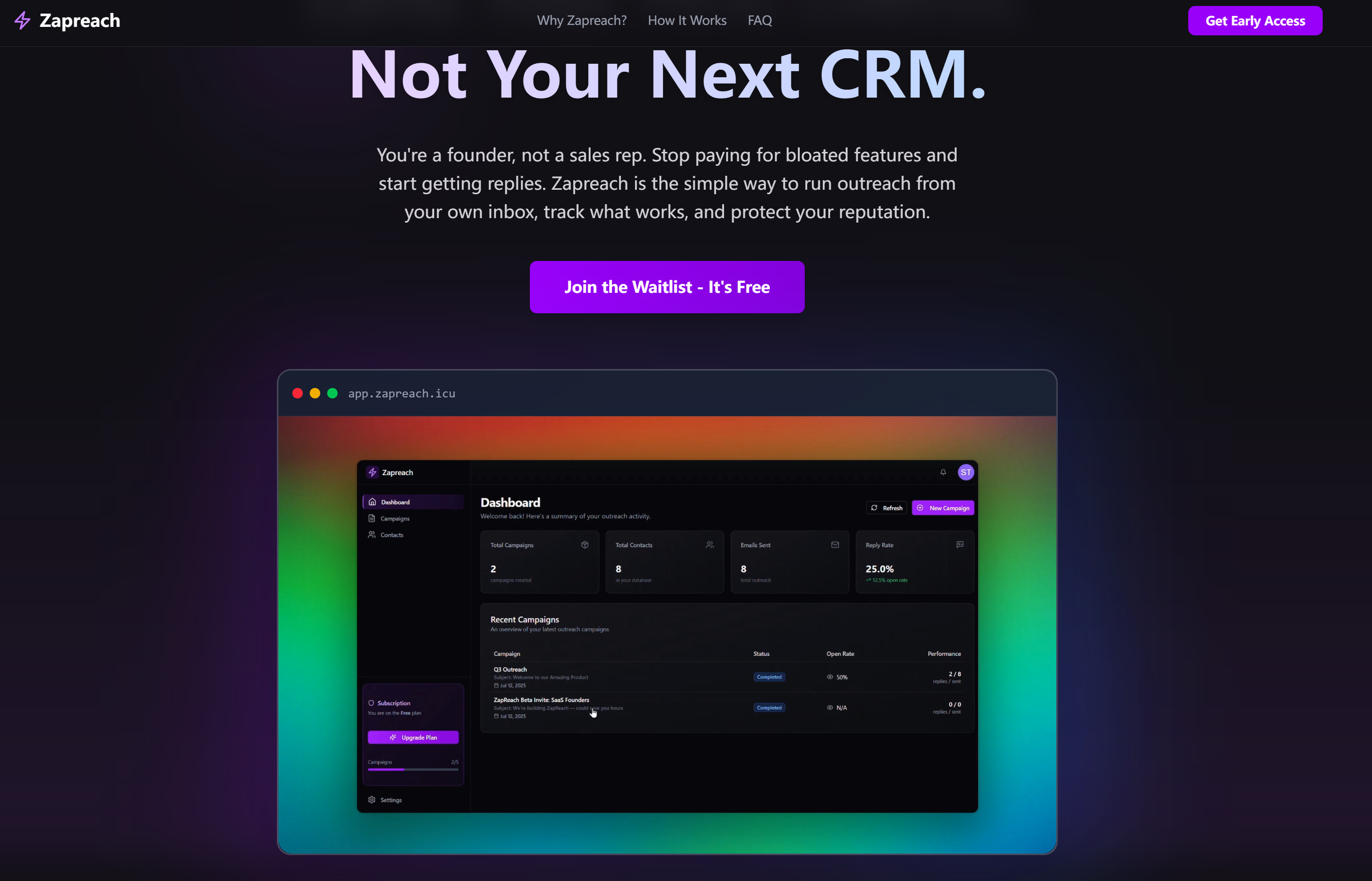 Zapreach是一款极简的冷外联工具,快速上传线索、无每日发送限制、清晰追踪打开和回复,并内置管理回复的收件箱。