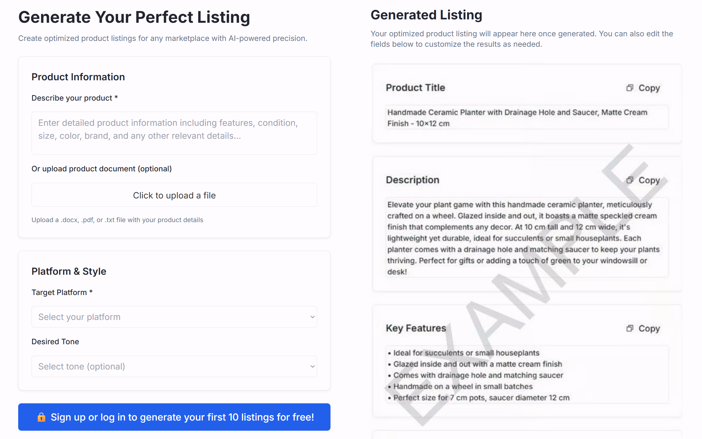 MarketListerPro是一款自动生成eBay、Etsy、Shopify等平台产品列表的软件,能够输出SEO优化的产品标题、要点、描述和标签,格式清晰一致,支持手动输入或文件上传。