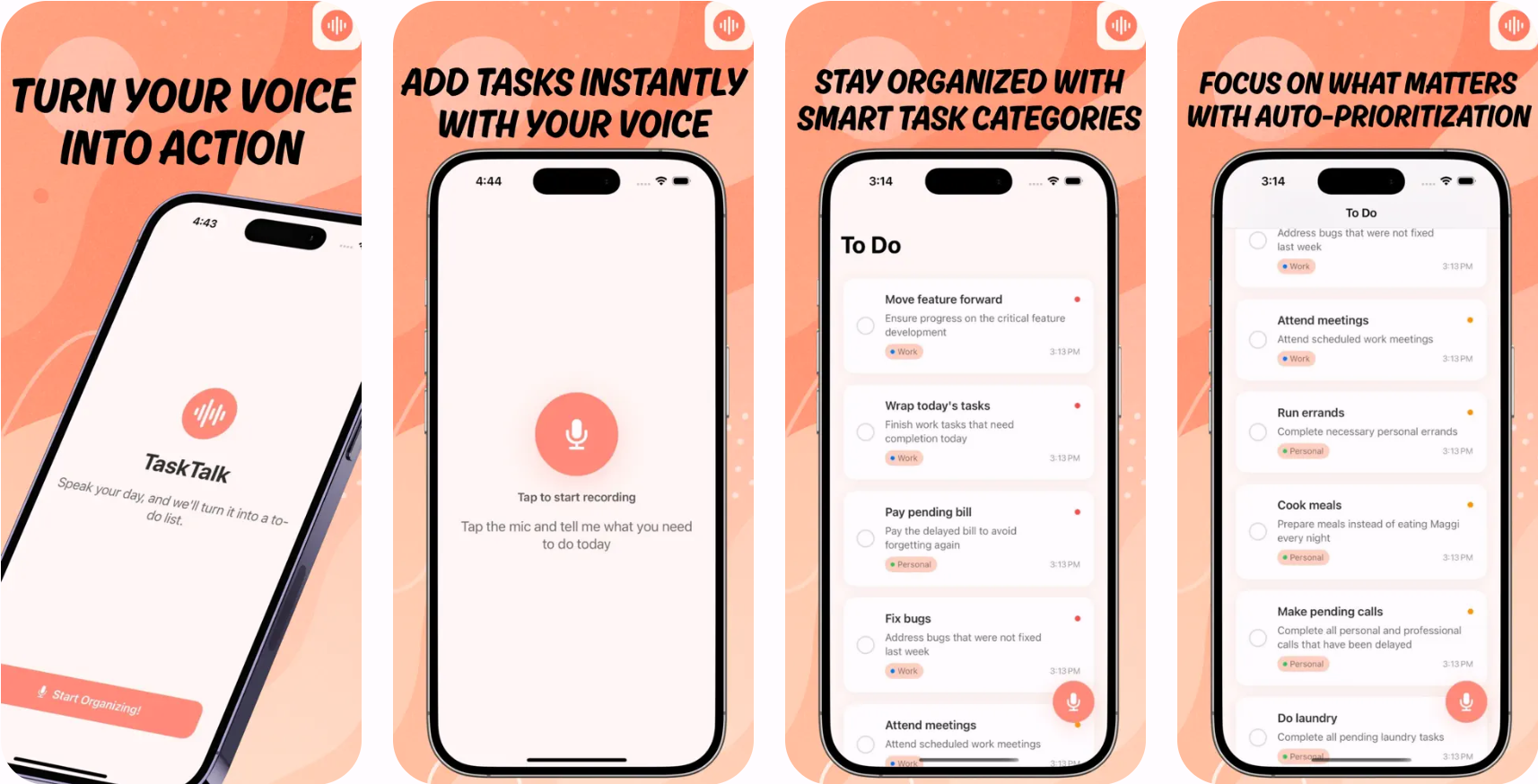 TaskTalk是一款语音任务管理应用,用户可以通过语音输入自动提取任务并优先排序,随时调整待办事项。