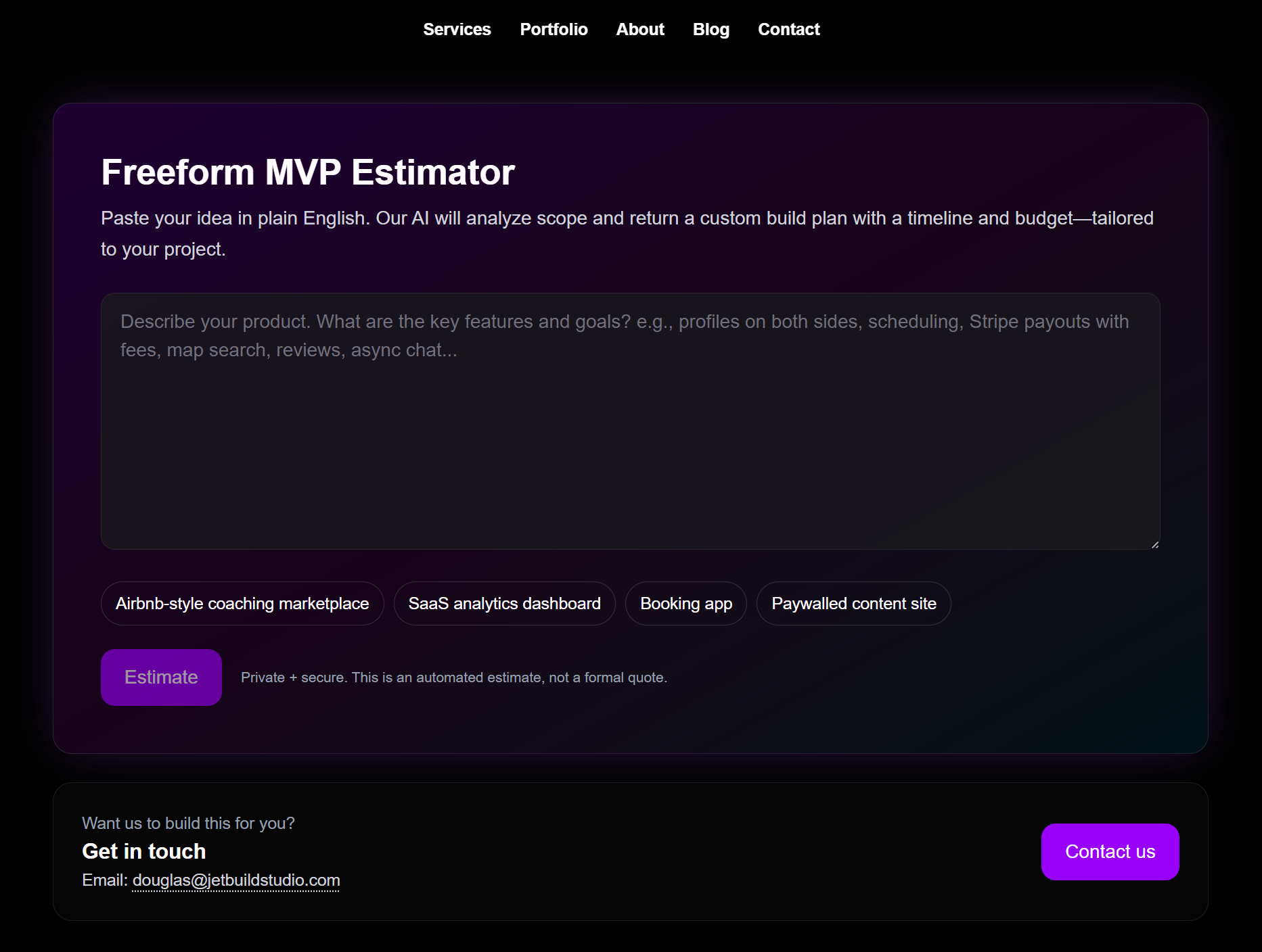 Jetbuild Studio Cost Estimator是一款AI驱动的成本估算工具,帮助用户快速估算SaaS/Bubble MVP的开发时间和预算。