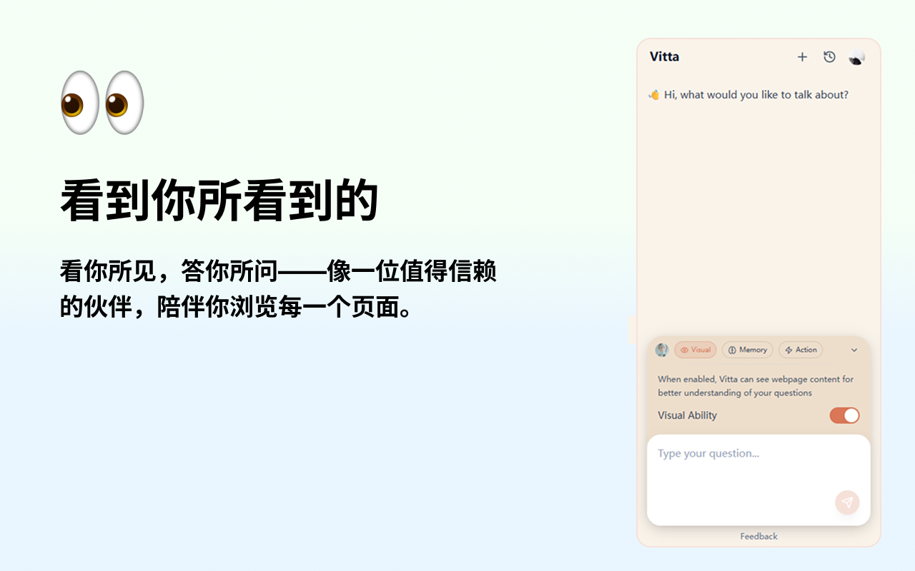 Vitta是一款浏览器AI助理,具备视觉和记忆功能,能够理解用户偏好并快速回答问题。