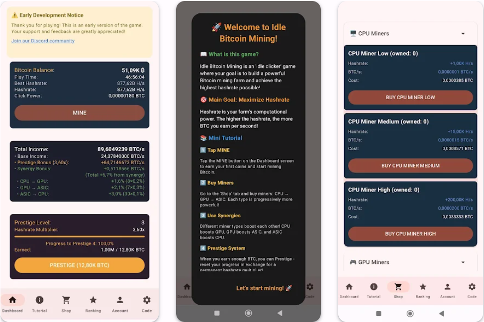 IDLE Bitcoin Mining是一款放置类游戏,玩家可以升级硬件、提升算力,并进行长期进度的增益。